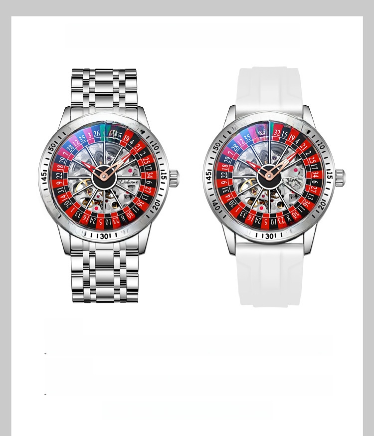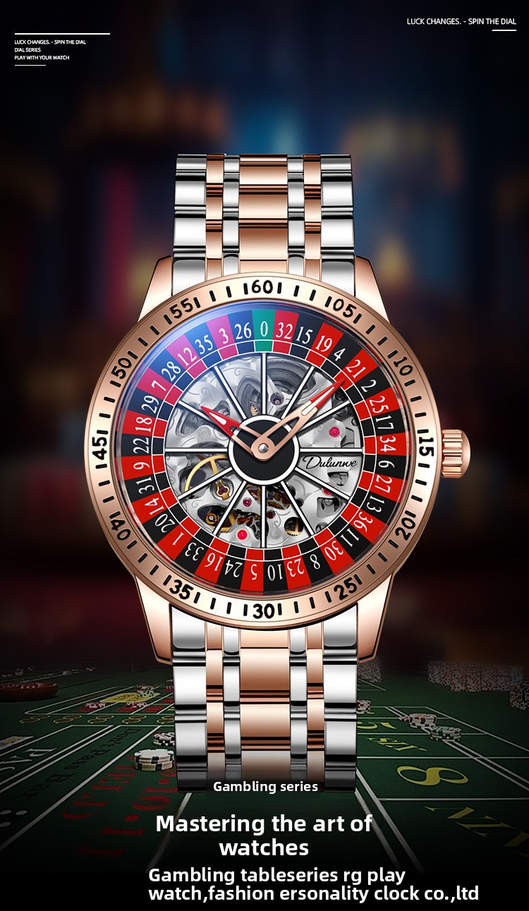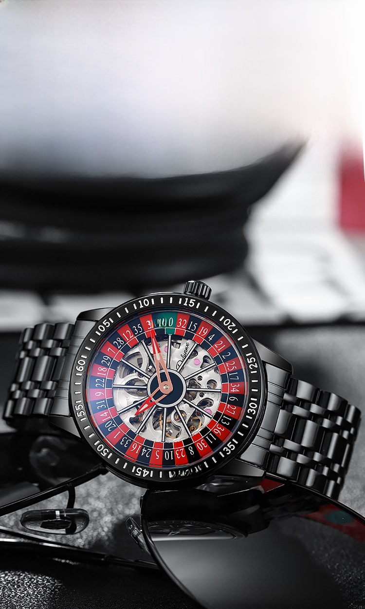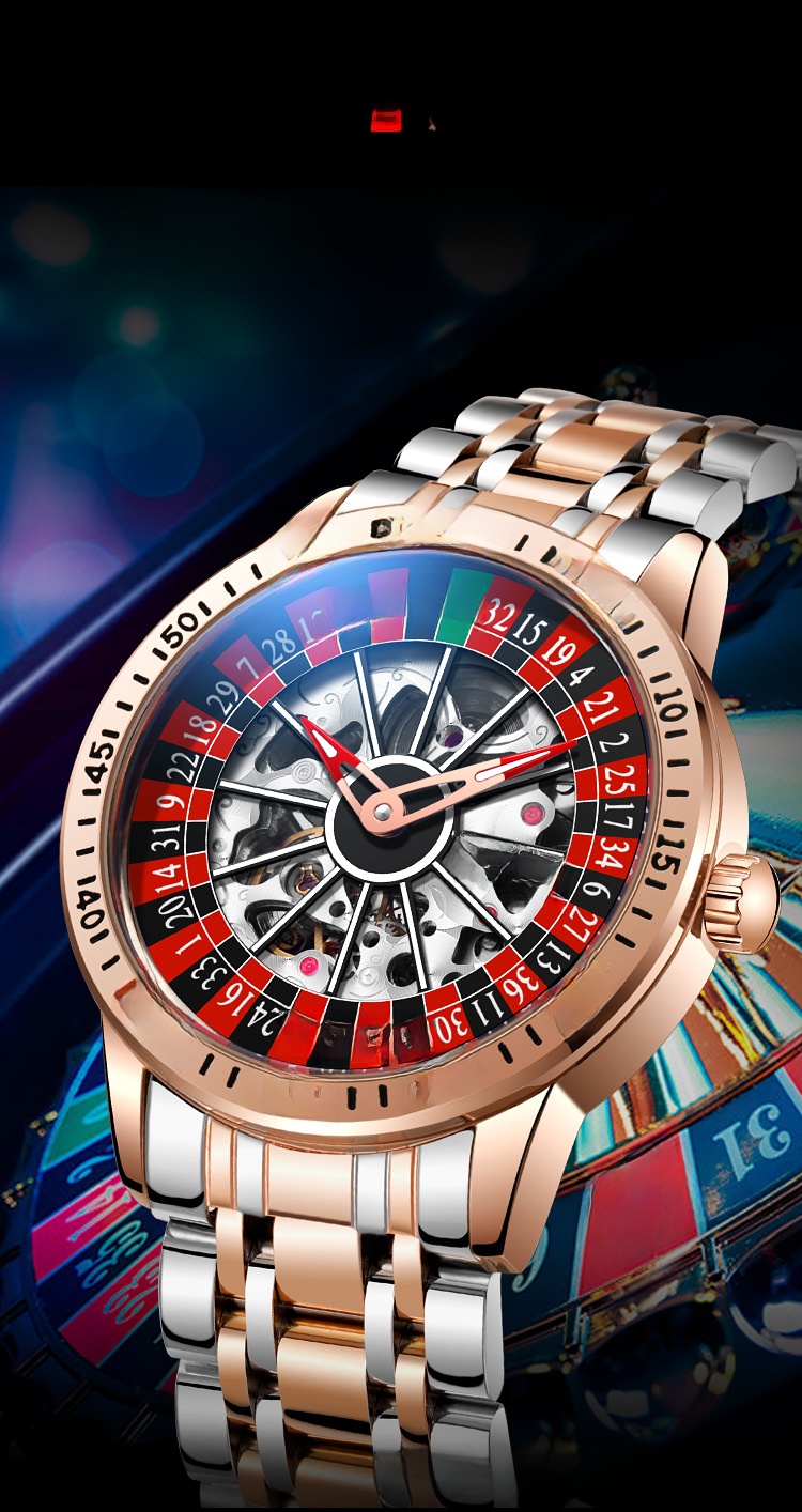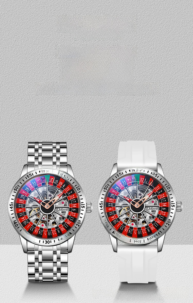 Roulette Dial: Unique gambling-themed design with a stylish roulette pattern on the dial.